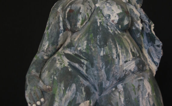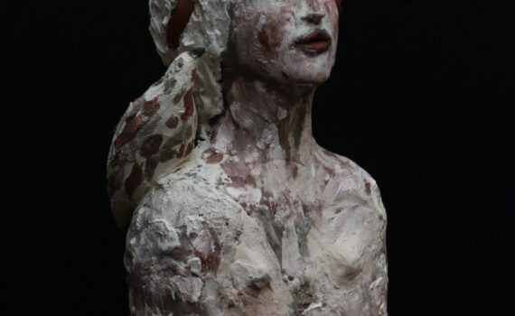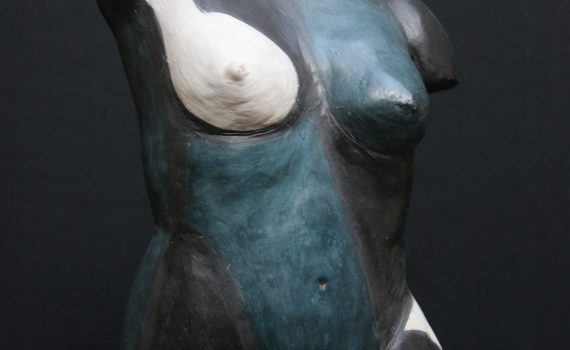 « Muse » était noir et blanc pour répondre au thème d’une exposition à Vendôme. J’ai souhaité le modifier. J’ai enlevé toute la patine noir et blanc. Pose d’un engobe et passage au four électrique. Puis utilisation de pigment pour obtenir des couleurs nuancées.