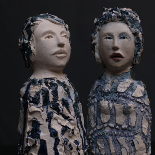 Autodidacte. Depuis cinq ans j'ai le plaisir de pétrir, tordre, étirer, la terre dans tous les sens. Il en surgit des personnages principalement féminin, des visages, des bustes... mais aussi des pommes.